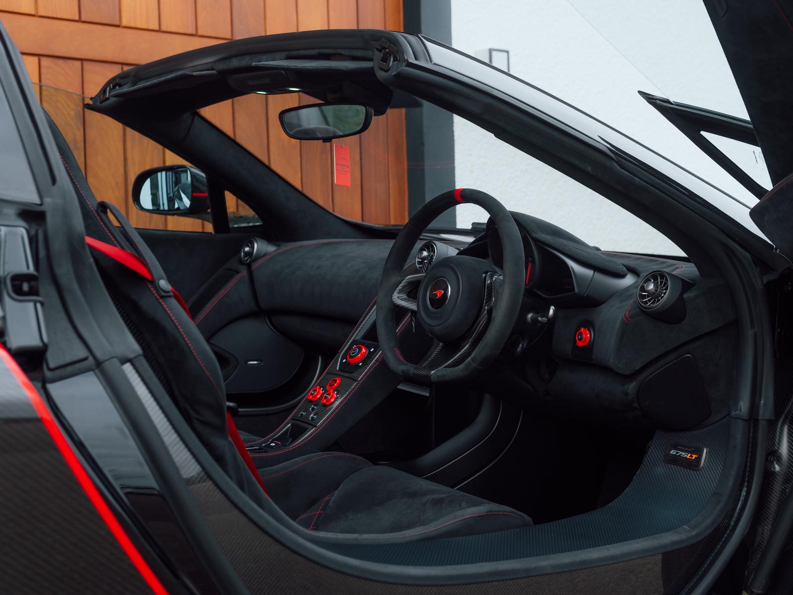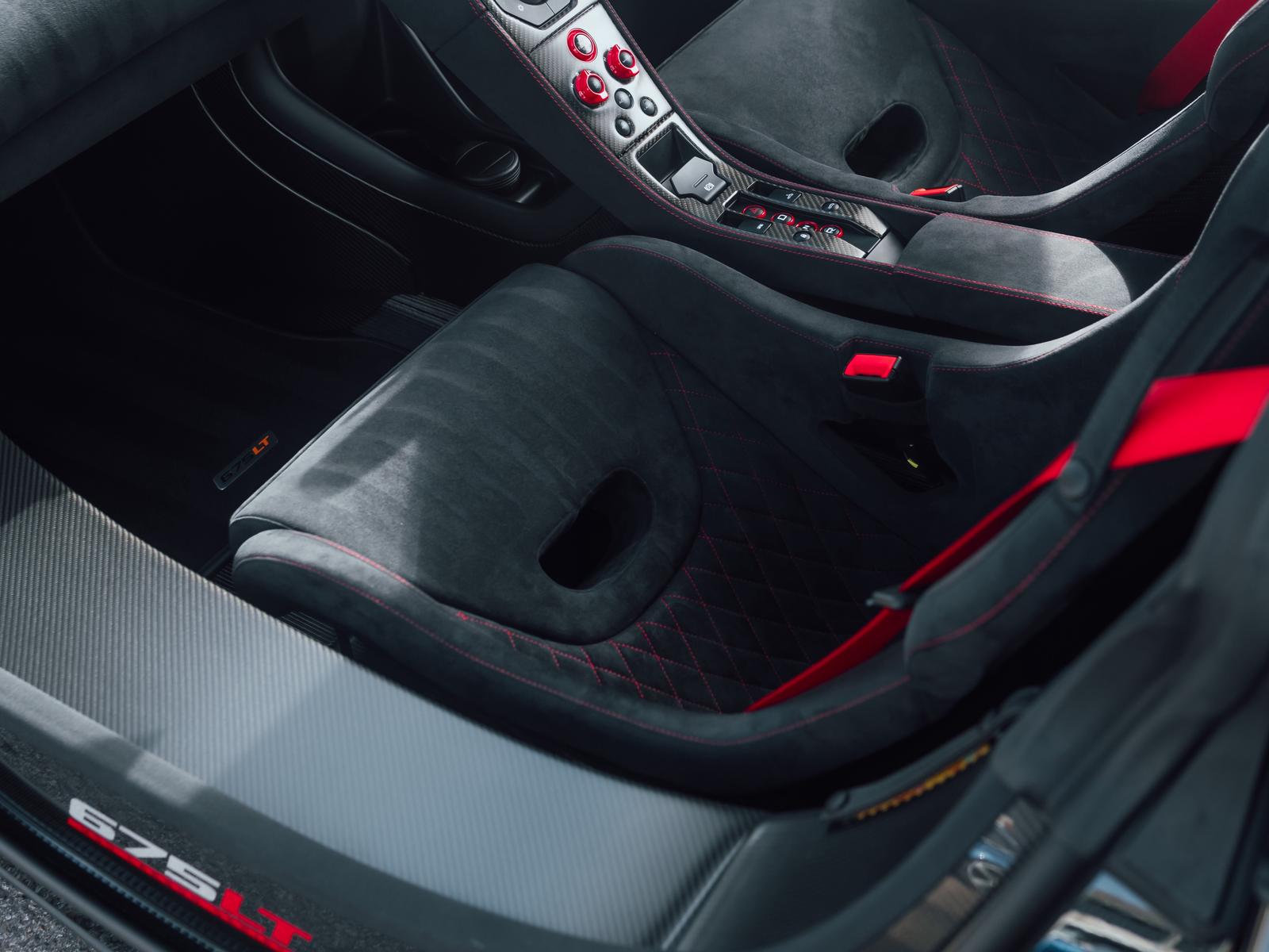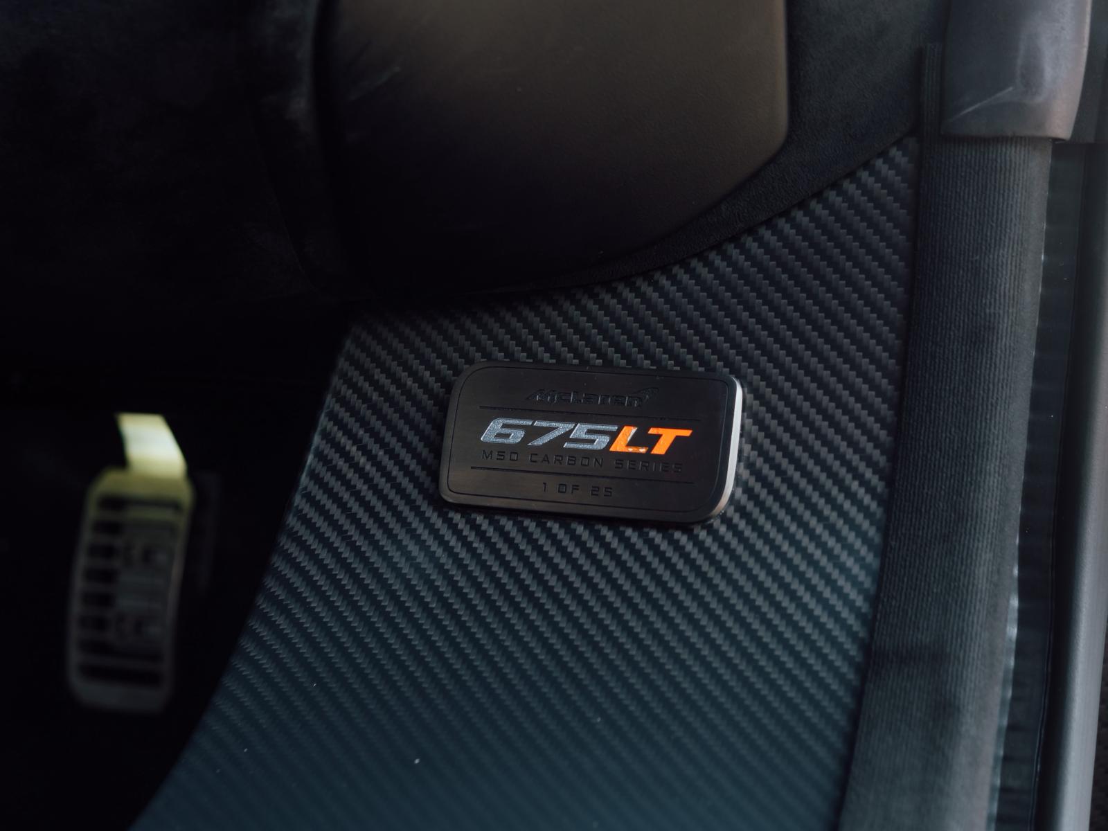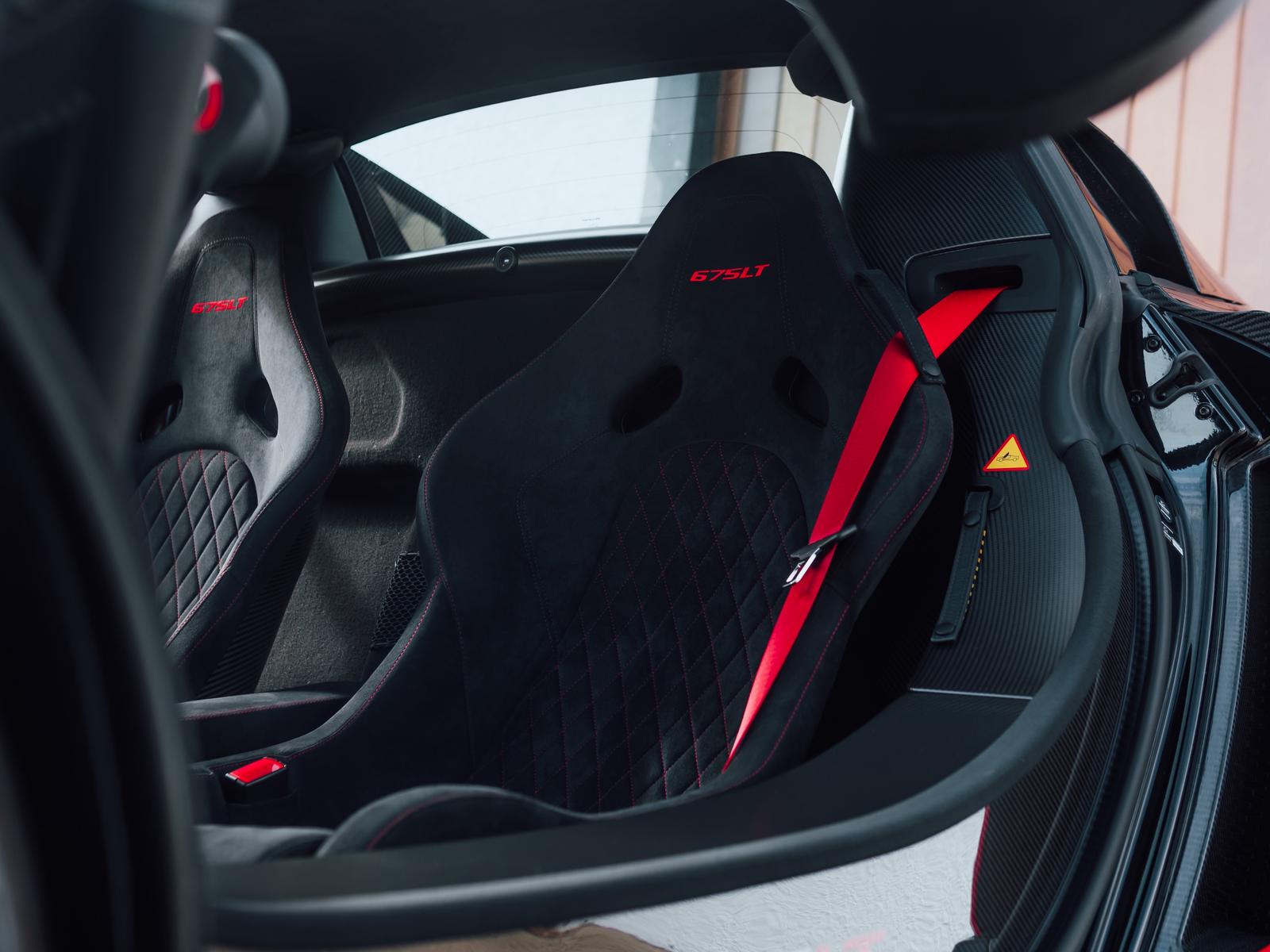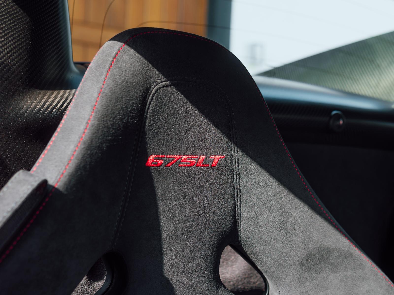 This particular car is exceptionally specified. It features MSO Bespoke Red detailing throughout the interior and exterior, the only car optioned as such as a nod to the Visual Carbon P1. Highlights include extensive Red pin striping and matching callipers. The interior is equally impressive. Full carbon fibre racing seats, inspired by the P1, are trimmed in Carbon Black Alcantara and finished with red cross-stitching and embroidered ‘675LT’ headrests. A bespoke MSO steering wheel, extended Alcantara trim, and continued red accenting.